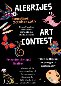 All submitted artwork will be displayed at the Chaska Community Center’s Art Gallery, alongside our annual Ofrenda. This special exhibition will be open to the public, allowing visitors to admire the creativity of our young artists and cast their votes for their favorite pieces. Any media accepted.